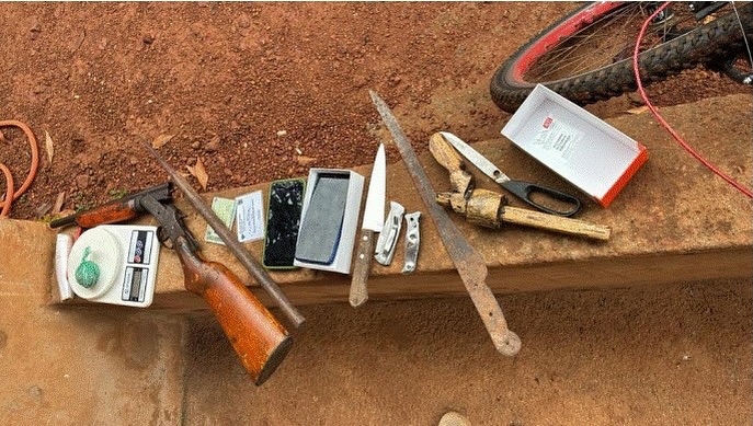 Durante as buscas no imóvel, as equipes policiais encontraram uma espingarda de calibre indefinido, uma balança de precisão, um pequeno tablete de maconha e R$ 152 em dinheiro. Três aparelhos celulares também foram apreendidos para serem periciados, visando auxiliar nas investigações.
