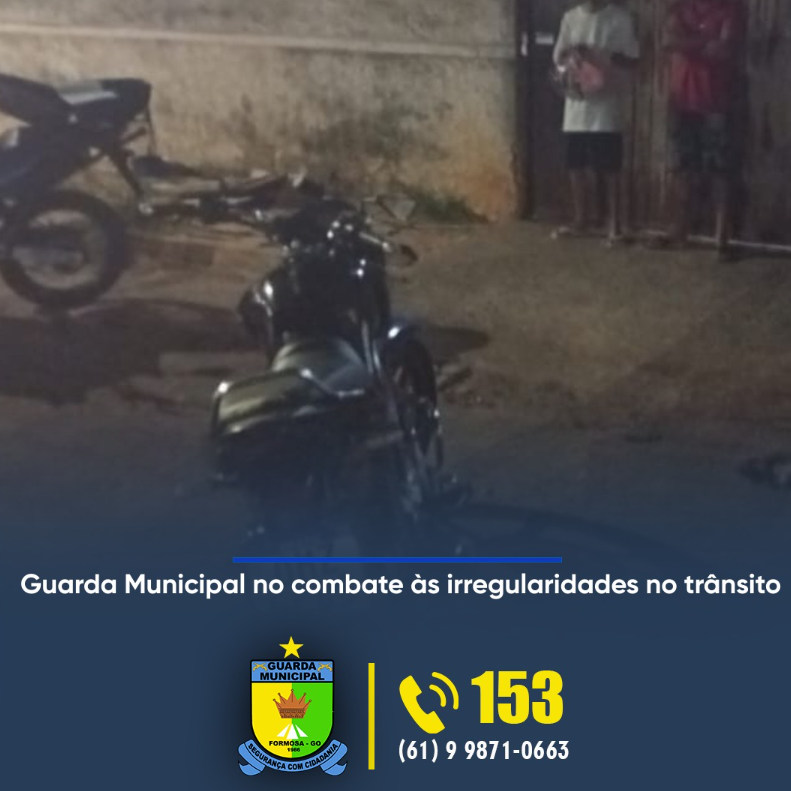 Na noite deste sábado (27), a Guarda Municipal de Formosa, por meio da Equipe Charlie, realizou a apreensão de uma motocicleta que circulava de forma irregular na Rua Trajano Balduíno. A ação ocorreu por volta das 20h50, como parte do patrulhamento preventivo na região.