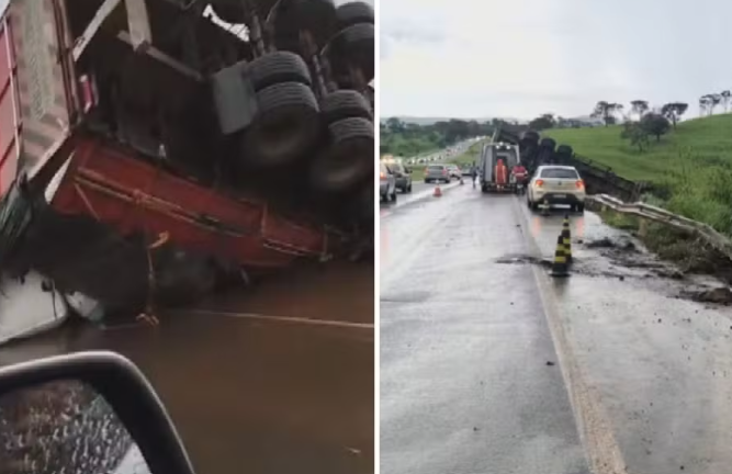 O mesmo caminhão acabou tombando sobre o carro de passeio das vítimas, esmagando o veículo sob a carga pesada.